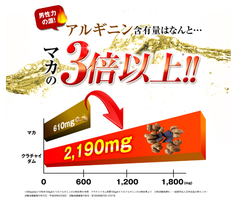 クラチャイダムに含まれるアルギニン量は、なんとマカの2倍以上。 理系的に考えれば、同じ1粒を飲むなら、マカを飲むよりクラチャイダムを飲む方が、血中のアルギニン濃度を2倍効率的に高められるということになる。